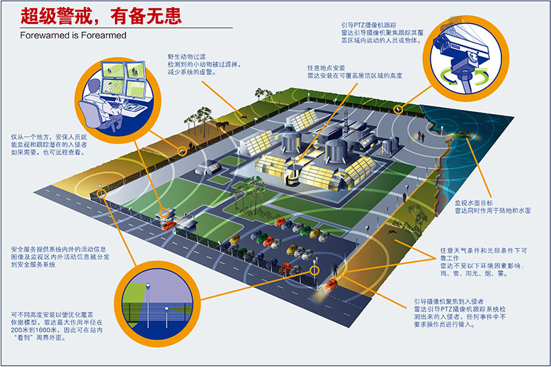 ◆ 雷達的工作不受氣象條件限制。攝像頭如需夜視功能則需要紅外攝像頭或熱成像攝像頭,但極端條件下,如大霧,即使熱成像攝像頭的監控能力也會大幅下降。