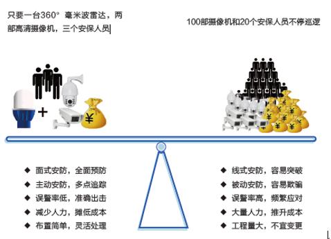 ◆ 雷達作為安防應用可以單獨使用,但我們強烈推薦雷達配合其他系統一起使用。雷達、攝像頭、運動檢測器各有利弊。